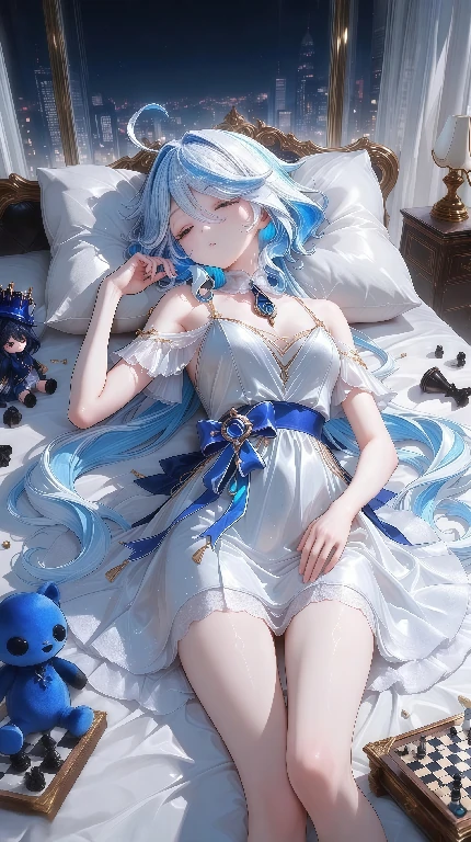 当都市的霓虹漫过落地窗纱,这间铺着柔白床单的卧室,成了蓝发少女的专属梦境。她蜷在蓬松枕间,银白睡裙缀着淡蓝丝带,长发像揉碎的晴空铺展在床沿。枕边的蓝绒玩偶、散着的棋盘棋子,还有复古相机,都成了这场酣眠里的温柔注脚 —— 夜还长,就让她在这盏暖灯与星光的包裹里,多沉溺一会儿吧。